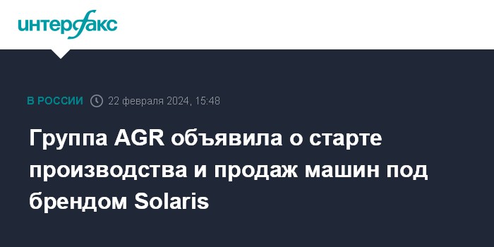 Москва. 22 февраля. INTERFAX.RU - AGR Automotive Group (ООО "АГР"), владеющая бывшим заводом Hyundai в Санкт-Петербурге, объявила о старте производства автомобилей под брендом Solaris и их продаж на российском рынке.