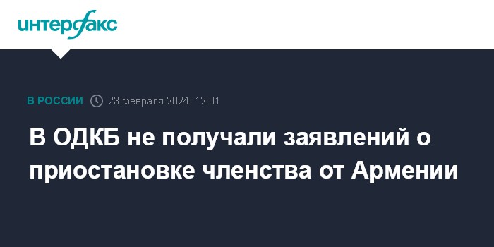Москва. 23 февраля. INTERFAX.RU - Организация договора о коллективной безопасности не получала официальных заявлений от Армении о приостановке участия в деятельности ОДКБ.