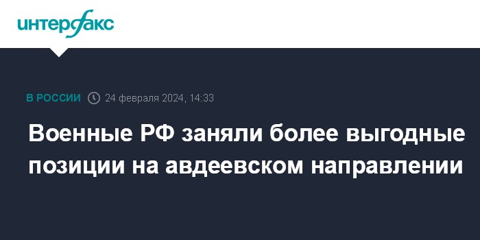 Москва. 24 февраля. INTERFAX.RU - Российские войска после взятия под контроль города Авдеевка занимают более выгодные рубежи и позиции, сообщило Минобороны РФ в субботу.