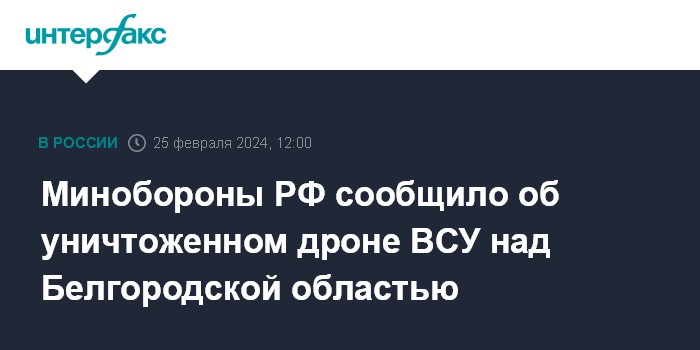 Москва. 25 февраля. INTERFAX.RU - Российские военные около 11:00 воскресенья уничтожили украинский дрон над Белгородской областью, заявили в Минобороны РФ.