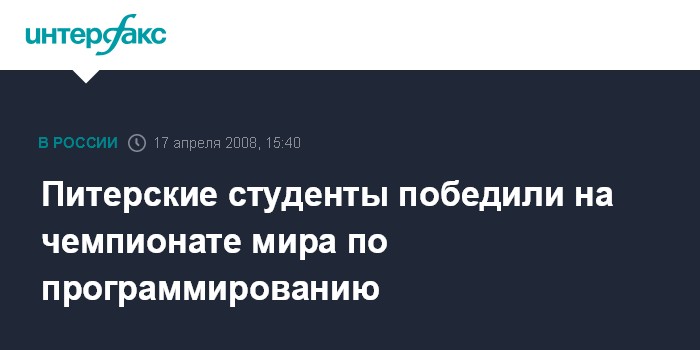 Санкт-Петербург. 17 апреля. INTERFAX.RU - Студенты Петербургского университета информационных технологий, механики и оптики получили золотую медаль на 32-м чемпионате мира по программированию "Битва интеллектов", который проходил в Канаде. Об этом сообщил на пресс-конференции в агентстве "Интерфакс Северо-Запад" старший тренер команды, преподаватель СПбГУ ИТМО Андрей Станкевич.