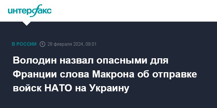 Москва. 28 февраля. INTERFAX.RU - Председатель Госдумы Вячеслав Володин подверг критике заявление президента Франции Эммануэля Макрона, в частности, о возможности отправки войск НАТО на Украину.