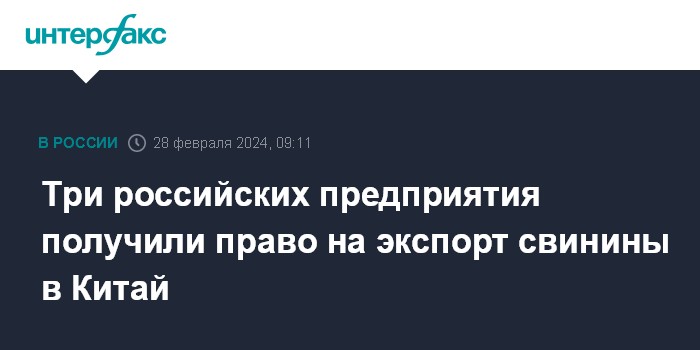 Как сообщили "Интерфаксу" в пресс-службе Россельхознадзора, право на экспорт своей свиноводческой продукции в Китай получили АПХ "Мираторг", Великолукский мясокомбинат и "Тамбовский бекон" (входит в ГК "Русагро").