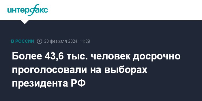 Москва. 28 февраля. INTERFAX.RU - Более 43,6 тыс. избирателей досрочно проголосовали на выборах президента России в 18 регионах страны, сообщила глава ЦИК РФ Элла Памфилова.