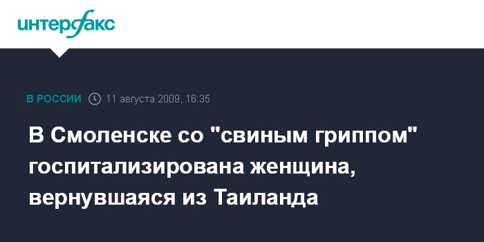 Москва. 11 августа. INTERFAX.RU - В Смоленске выявлен первый случай заболевания "свиным гриппом", сообщили "Интерфаксу" во вторник в администрации города. Как рассказал собеседник агентства. на лечении в Смоленской городской клинической больнице находится женщина, которой поставлен диагноз "свиной грипп". По его словам, за медицинской помощью женщина обратилась самостоятельно, почувствовав недомогание после возвращения из Таиланда. "Все необходимые для пресечения распространения вируса действия предприняты", - подчеркнули в администрации.