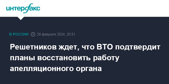 Замглавы Минэкономразвития РФ: все участники ВТО заинтересованы в ее реформеЧитать подробнее"Дедлайн формально - это 2024 год (возобновление работы апелляционного органа - ИФ), который еще не истек. Все еще в течение года будут к этому стремиться", - сказал он журналистам в кулуарах 13-й министерской конференции ВТО, которая с 26 по 29 февраля проходит в Абу-Даби (Решетников возглавляет на ней российскую делегацию).