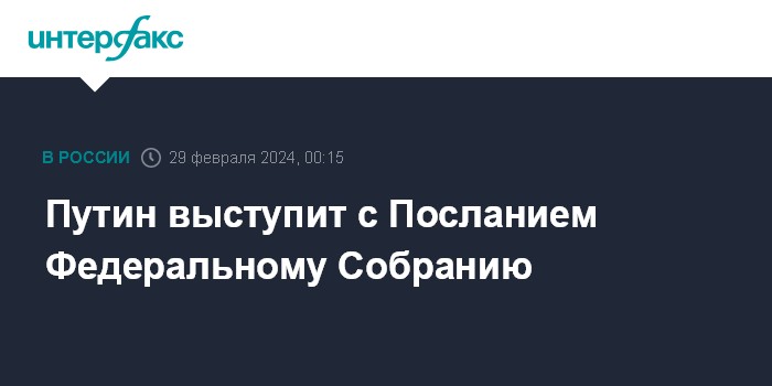 Москва. 29 февраля. INTERFAX.RU - Президент РФ Владимир Путин в четверг, 29 февраля, обратится к Федеральному Собранию с ежегодным Посланием.