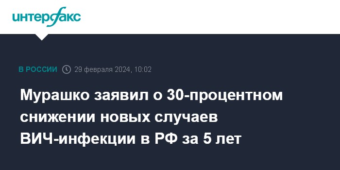 Москва. 29 февраля. INTERFAX.RU - Количество новых случаев ВИЧ-инфекции в России за пять лет снизилось почти на треть, сообщил министр здравоохранения РФ Михаил Мурашко.