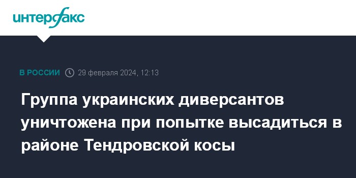 Москва. 29 февраля. INTERFAX.RU - На херсонском направлении уничтожена украинская диверсионная группа сил спецопераций ВМС Украины, попытавшаяся высадиться в районе Тендровской косы, заявили в Минобороны России.