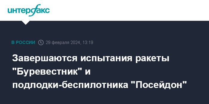 Москва. 29 февраля. INTERFAX.RU - Испытания ядерной крылатой ракеты неограниченной дальности "Буревестник" и беспилотного подводного аппарата "Посейдон" завершаются, они подтвердили свои высокие характеристики, заявил президент РФ Владимир Путин, выступая в четверг с посланием Федеральному Собранию.