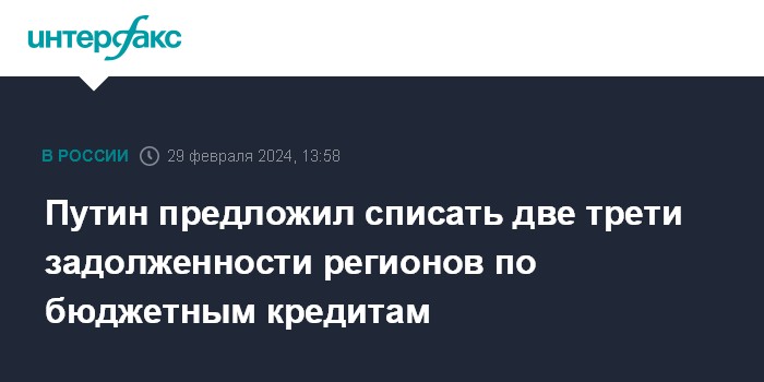 Москва. 29 февраля. INTERFAX.RU - Президент Владимир Путин в послании предложил списать две трети задолженности регионов по бюджетным кредитам, сэкономленные 200 млрд рублей должны быть направлены ими на поддержку инвестиций и в инфраструктурные проекты.
