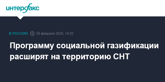 Москва. 29 февраля. INTERFAX.RU - Программа социальной газификации будет расширена на садоводческие товарищества, заявил в ходе послания Федеральному собранию президент России Владимир Путин.