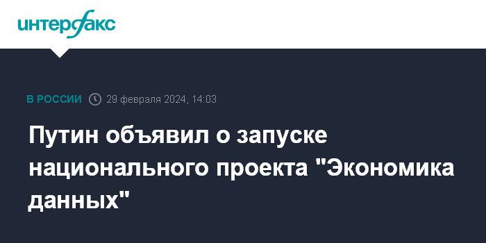Москва. 29 февраля. INTERFAX.RU - Президент РФ Владимир Путин в послании Федеральному собранию объявил о запуске еще одного нового нацпроекта - "Экономика данных".