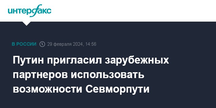 Москва. 29 февраля. INTERFAX.RU - Россия обеспечит круглогодичную навигацию на Северном морском пути, приглашает зарубежных партнеров использовать этот маршрут. Об этом заявил президент РФ Владимир Путин в послании Федеральному Собранию.