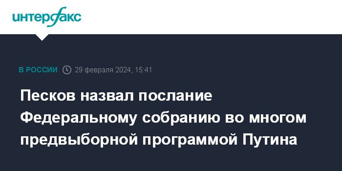 "Продолжительность послания объясняется тем, что это во многом предвыборная программа кандидата, это видение кандидата в президенты Путина. Здесь два формата совпали", - сказал Песков телеканалу "Звезда".