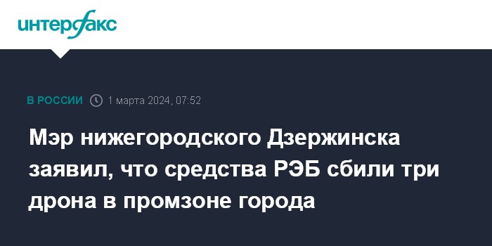 Мэр нижегородского Дзержинска заявил, что средства РЭБ сбили три дрона в промзоне города