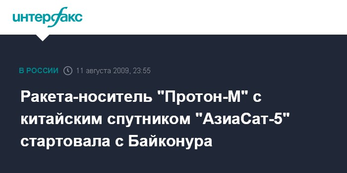 Москва. 11 августа. ИНТЕРФАКС-АВН - Телекоммуникационный космический аппарат "АзиаСат-5" (AsiaSat-5) запущен во вторник с космодрома Байконур (Казахстан) с помощью российской ракеты-носителя "Протон-М", сообщили "Интерфаксу-АВН" в пресс-службе Роскосмоса.