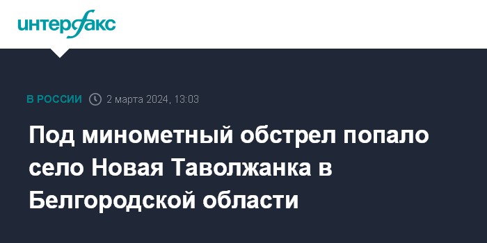 Москва. 2 марта. INTERFAX.RU - Губернатор Белгородской области Вячеслав Гладков сообщил о минометном обстреле, под который попало село Новая Таволжанка Шебекинского городского округа, пострадавших нет.