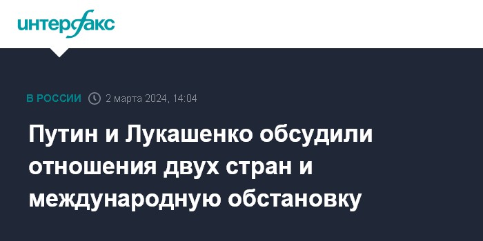 Москва. 2 марта. INTERFAX.RU - Состоялся телефонный разговор президента Российской Федерации Владимира Путина с президентом Белоруссии Александром Лукашенко, сообщила пресс-служба Кремля.