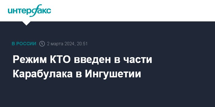 Москва. 2 марта. INTERFAX.RU - Режим контртеррористической операции введен в части города Карабулак в Ингушетии, сообщает правительство республики со ссылкой на оперштаб.