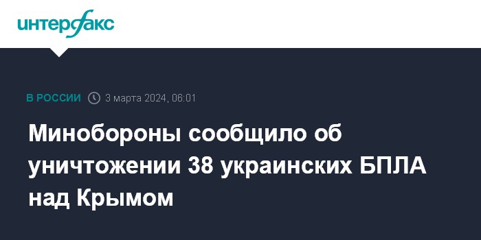 Москва. 3 марта. INTERFAX.RU - Российские военные нейтрализовали 38 дронов ВСУ в небе над Крымом, сообщило Минобороны России.