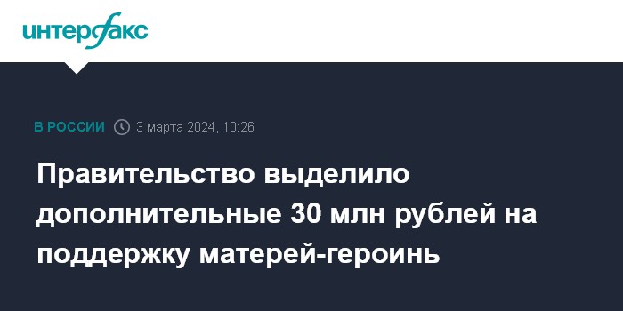Москва. 3 марта. INTERFAX.RU - Премьер-министр РФ Михаил Мишустин распорядился дополнительно выделить из резервного фонда правительства более 30 млн рублей на единовременные выплаты матерям-героиням, а также родителям, награжденным орденом "Родительская слава" или медалью этого ордена.