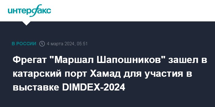Москва. 4 марта. INTERFAX.RU - Фрегат Тихоокеанского флота (ТОФ) России "Маршал Шапошников" зашел в катарский порт Хамад, где примет участие в оборонной выставке DIMDEX-2024, сообщает пресс-служба ТОФ в понедельник.