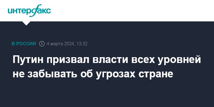 Москва. 4 марта. INTERFAX.RU - Российские власти всех уровней должны помнить, что угрозы, которые пытаются создать стране, не пустые, заявил в понедельник президент РФ Владимир Путин.