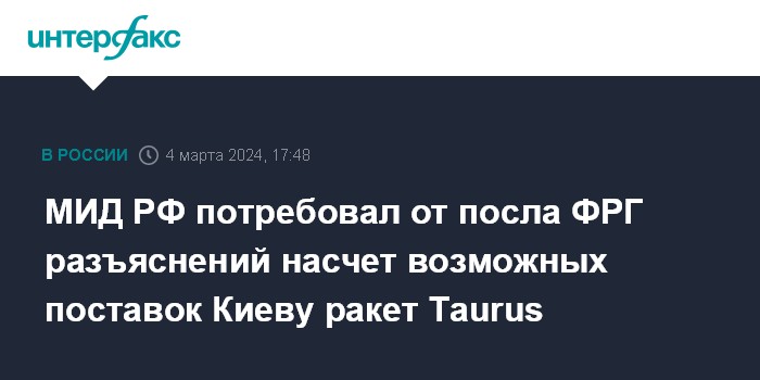 "4 марта в ходе демарша в МИД России потребовали от чрезвычайного и полномочного посла Федеративной Республики Германия Ламбсдорффа разъяснений в связи с обсуждением в разговоре высших германских офицеров возможности поставок киевскому режиму дальнобойных крылатых ракет "Таурус", а также оказания ВСУ практической помощи в их боевом использовании по целям в России", - говорится в сообщении, опубликованном на сайте МИД РФ.