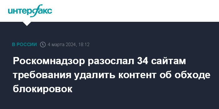Москва. 4 марта. INTERFAX.RU - Роскомнадзор с 1 марта направил владельцам сайтов 34 уведомления о необходимости удаления контента, рекламирующего и популяризирующего обход блокировок, из них шесть страниц были заблокированы, сообщили "Интерфаксу" в пресс-службе ведомства.