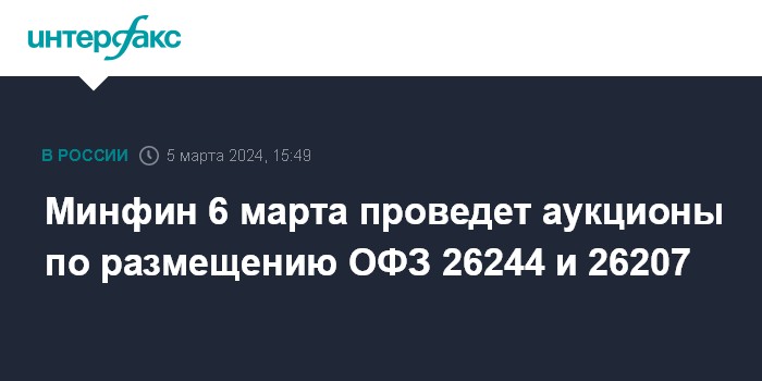 Минфин 6 марта проведет аукционы по размещению ОФЗ 26244 и 26207