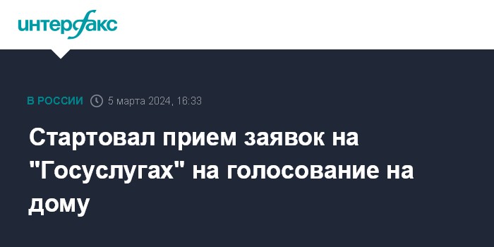 Москва. 5 марта. INTERFAX.RU - На портале государственных и муниципальных услуг ("Госуслуги") начался прием заявок для голосования граждан на президентских выборах на дому, сообщили в Минцифры России во вторник.