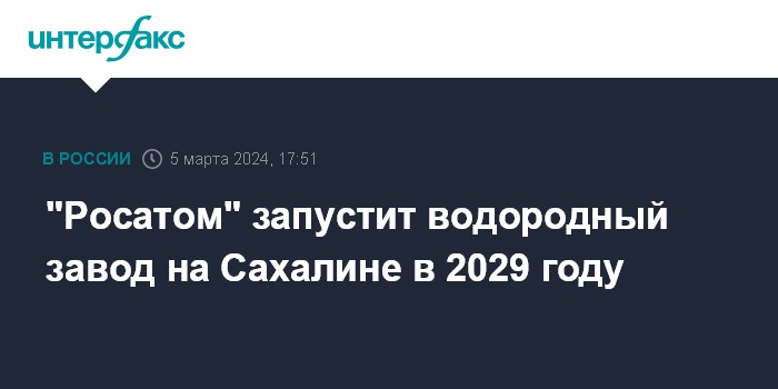 Москва. 5 марта. INTERFAX.RU - Госкорпорация "Росатом" планирует запуск завода по производству водорода на Сахалине в 2029 году, сообщил в Совете Федерации вице-президент АО "Русатом Оверсиз" Антон Москвин.