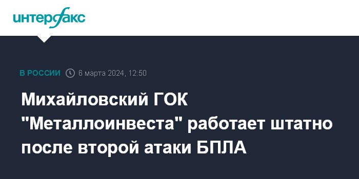 Москва. 6 марта. INTERFAX.RU - Михайловский ГОК "Металлоинвеста" подтвердил, что его склад горюче-смазочных материалов в Железногорске был 6 марта дважды атакован дронами, и после второго удара работает штатно.