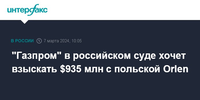 Москва. 7 марта. INTERFAX.RU - ПАО "Газпром" подало в Арбитражный суд Санкт-Петербурга и Ленинградской области иск к польскому нефтяному концерну Orlen SA о взыскании в общей сложности $935 млн, сообщается в арбитражной картотеке.