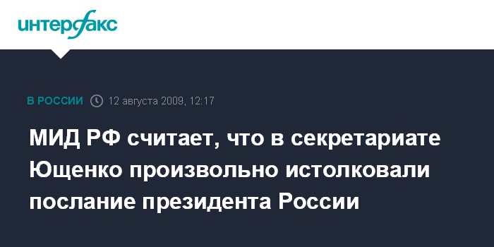 Москва. 12 августа. INTERFAX.RU - Секретариат президента Украины Виктора Ющенко произвольно интерпретировал послание российского президента Дмитрия Медведева, усмотрев в нем элемент агрессии, заявил статс-секретарь - замглавы МИД РФ Григорий Карасин.