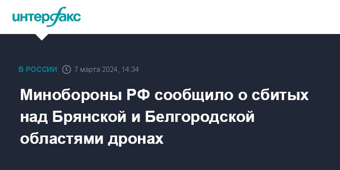 Минобороны РФ сообщило о сбитых над Брянской и Белгородской областями дронах