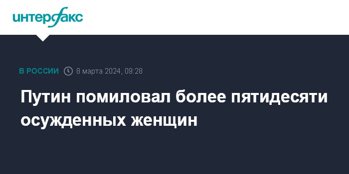 Москва. 8 марта. INTERFAX.RU - Президент России Владимир Путин подписал указ о помиловании 52 осужденных женщин, сообщает пресс-служба Кремля.