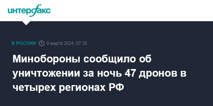 Москва. 9 марта. INTERFAX.RU - Российские военные в течение ночи перехватили 47 украинских беспилотников над четырьмя регионами, из них 41 дрон уничтожен над Ростовской областью, сообщили в Министерстве обороны России в субботу утром.