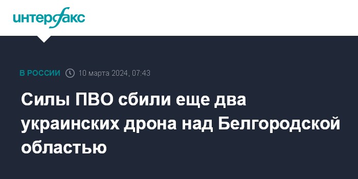 Москва. 10 марта. INTERFAX.RU - Российские военные около 6:40 по Москве нейтрализовали еще два украинских дрона самолетного типа над Белгородской областью, сообщили в Минобороны России.