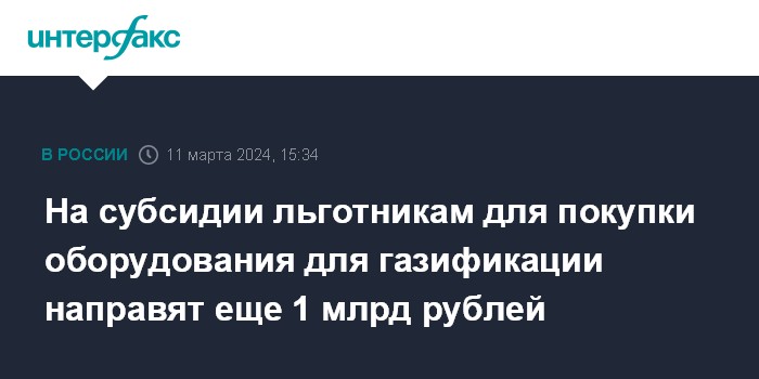 Москва. 11 марта. INTERFAX.RU - Правительство дополнительно направит из федерального бюджета в 2024 году 1 млрд рублей на субсидии льготным категориям граждан для приобретения оборудования для газификации, сообщил на оперативном совещании с вице-премьерами премьер-министр Михаил Мишустин.