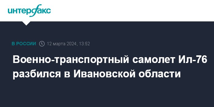 Москва. 12 марта. INTERFAX.RU - Военно-транспортный самолет Ил-76 потерпел крушение в Ивановской области, на борту находились 15 человек, сообщили в Минобороны РФ.