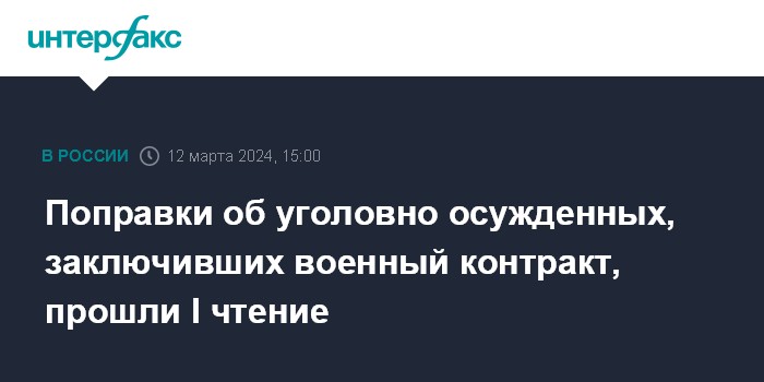 Москва. 12 марта. INTERFAX.RU - Госдума приняла в первом чтении законопроект об изменении реального наказания на условный срок для лиц, совершивших уголовное преступление и заключивших контракт о прохождении военной службы в Вооруженных силах России в период специальной военной операции.