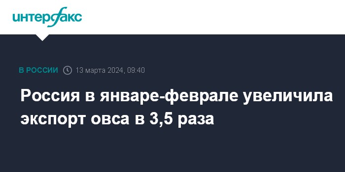 Москва. 13 марта. INTERFAX.RU - РФ в январе-феврале этого года экспортировала более 64 тыс. тонн овса, что в 3,5 раза больше, чем за аналогичный период прошлого года, сообщает центр "Агроэкспорт" при Минсельхозе.
