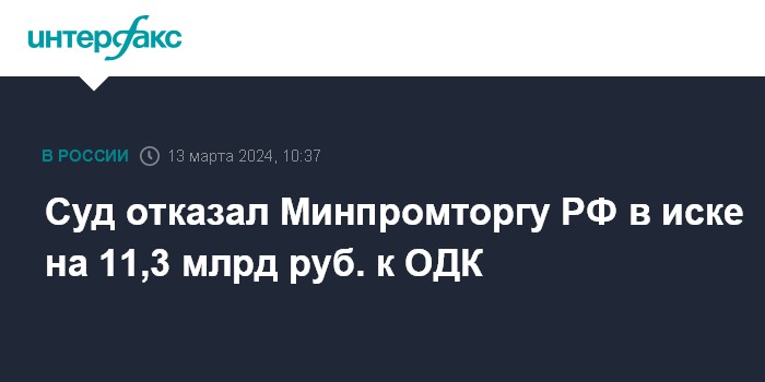 Москва. 13 марта. INTERFAX.RU - Арбитражный суд Москвы отказал Минпромторгу РФ в иске на 11,3 млрд рублей к "Объединенной двигателестроительной корпорации" (ОДК, входит в "Ростех").