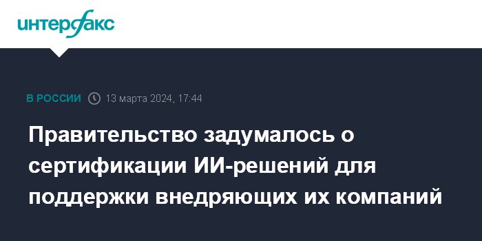Москва. 13 марта. INTERFAX.RU - Правительство РФ рассматривает возможность внедрения системы сертификации технологий искусственного интеллекта (ИИ) и предоставлять господдержку компаниям, внедряющим сертифицированные решения. Об этом сообщил глава Минэкономразвития Максим Решетников в ходе "Дня ИИ", проходящего на выставке-форуме "Россия".