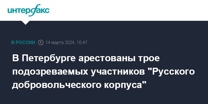 Москва. 14 марта. INTERFAX.RU - В Петербурге Дзержинский суд арестовал до 27 апреля троих подозреваемых в участии в запрещенной в России террористической организации "Русский добровольческий корпус" (РДК), сообщила пресс-служба судов города.