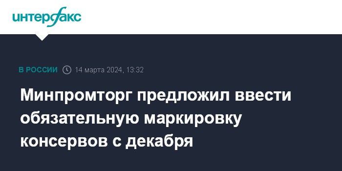 Москва. 14 марта. INTERFAX.RU - Минпромторг предложил ввести обязательную маркировку отдельных видов консервированных продуктов с 1 декабря 2024 года. Ведомство выложило на regulation.gov.ru проект такого постановления правительства.