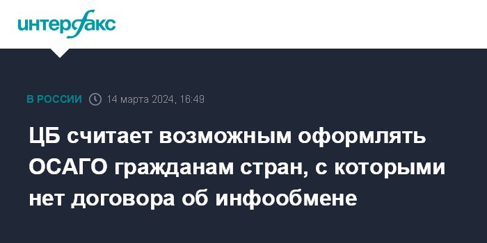 Москва. 14 марта. INTERFAX.RU - Банк России считает возможными оформление договора ОСАГО для владельцев транспортных средств с правами иностранных государств, даже если с этим государством на заключен договор информационного обмена, следует из информационного письма регулятора.