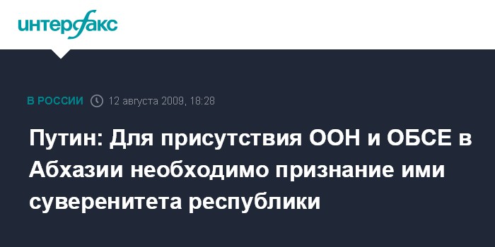 Сухуми. 12 августа. INTERFAX.RU - Премьер-министр РФ Владимир Путин обуславливает возможность присутствия в Абхазии представителей иностранных организаций - таких, как ООН и ОБСЕ признанием ими суверенитета республики.